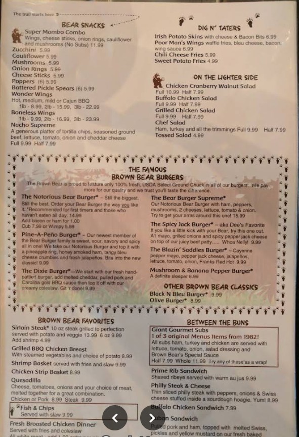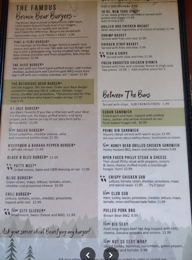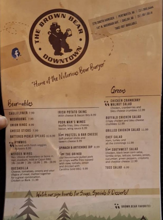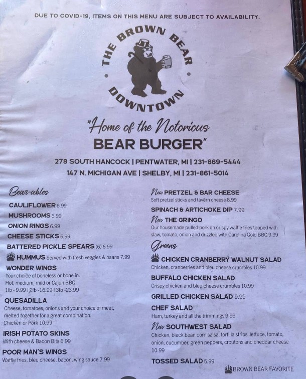The Brown Bear Restaurant menu features a wide selection of classic American bar & grill favorites, including handcrafted burgers, fresh seafood, hearty sandwiches, appetizers, and signature drinks. Located in Pentwater, Michigan, Brown Bear is known for its relaxed atmosphere, generous portions, and locally loved comfort food. Whether you're stopping by for lunch, dinner, or drinks, the Brown Bear Restaurant menu offers something for every appetite, from casual bites to satisfying full meals.